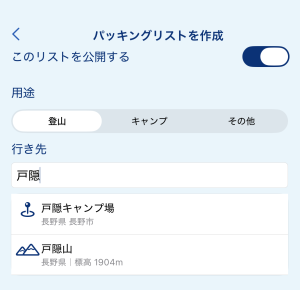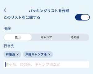 次に登る山や訪れるキャンプ場名を入力すると候補がサジェストされ、そのままタグとして簡単に登録できます。